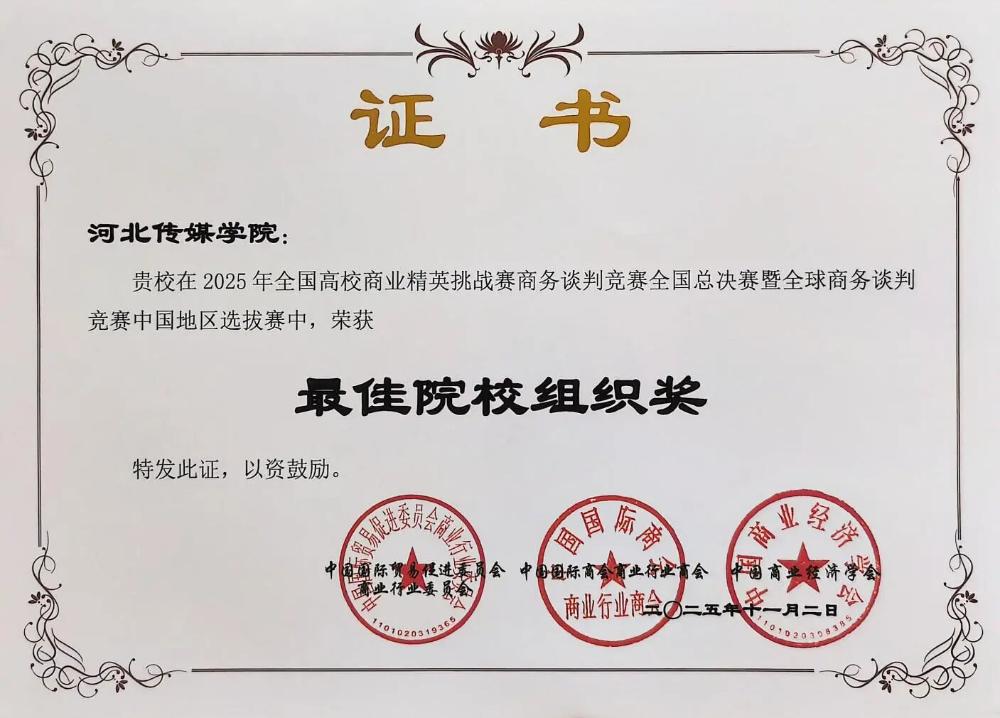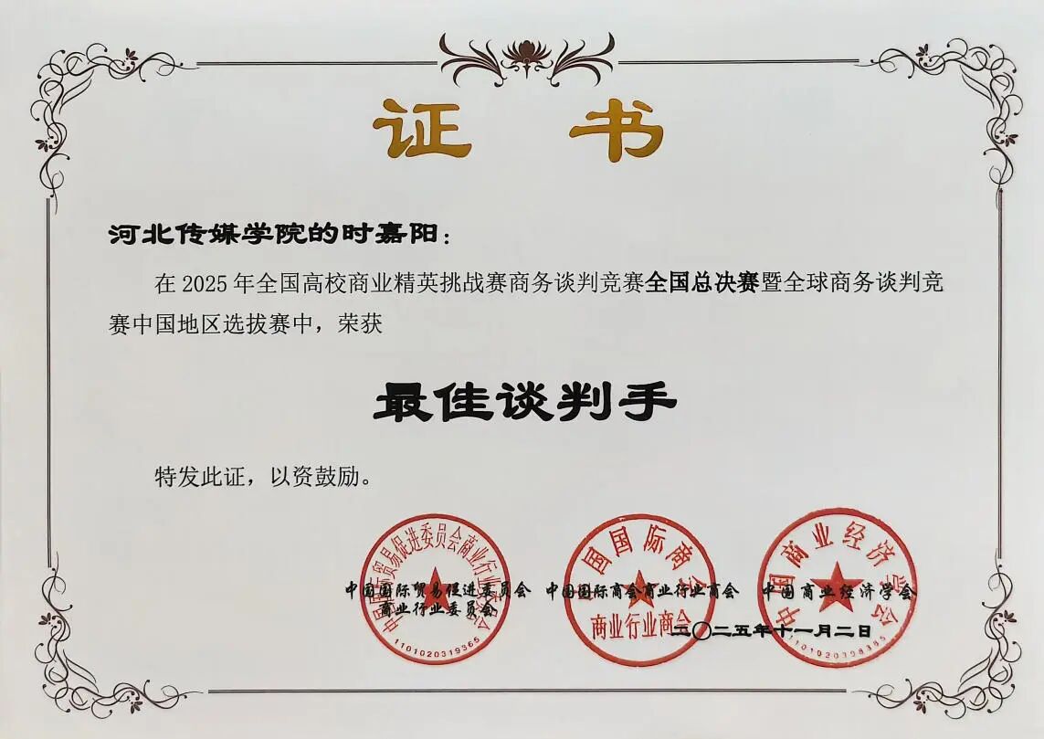 日前,2025年全国高校商业精英挑战赛商务谈判竞赛全国总决赛暨全球商务谈判竞赛中国地区选拔赛落下帷幕,我校文化产业管理学院派出的6支代表队在比赛中脱颖而出,2支队伍成功斩获全国一等奖,4支队伍荣获全国二等奖。值得一提的是,2024级文化产业管理专业时嘉阳同学在比赛中表现尤为出色,荣获“最佳谈判手”称号。同时,我校被授予“最佳院校组织奖”。